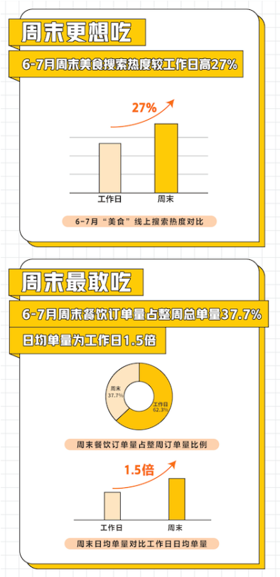 據(jù)美團(tuán)點評餐飲學(xué)院發(fā)布的《2020周末餐飲堂食消費(fèi)趨勢洞察》顯示,疫情恢復(fù)期,餐飲堂食消費(fèi)活力回歸,周末餐飲消費(fèi)對整個餐飲市場復(fù)蘇助力明顯。美團(tuán)6-7月線上美食搜索熱度中,周末的搜索熱度較工作日高出27%;周末餐飲線上訂單量占整周總單量的37.7%,日均單量為工作日的1.5倍。周末餐飲消費(fèi)拉動經(jīng)濟(jì)復(fù)蘇,正在成為驅(qū)動消費(fèi)的新引擎。