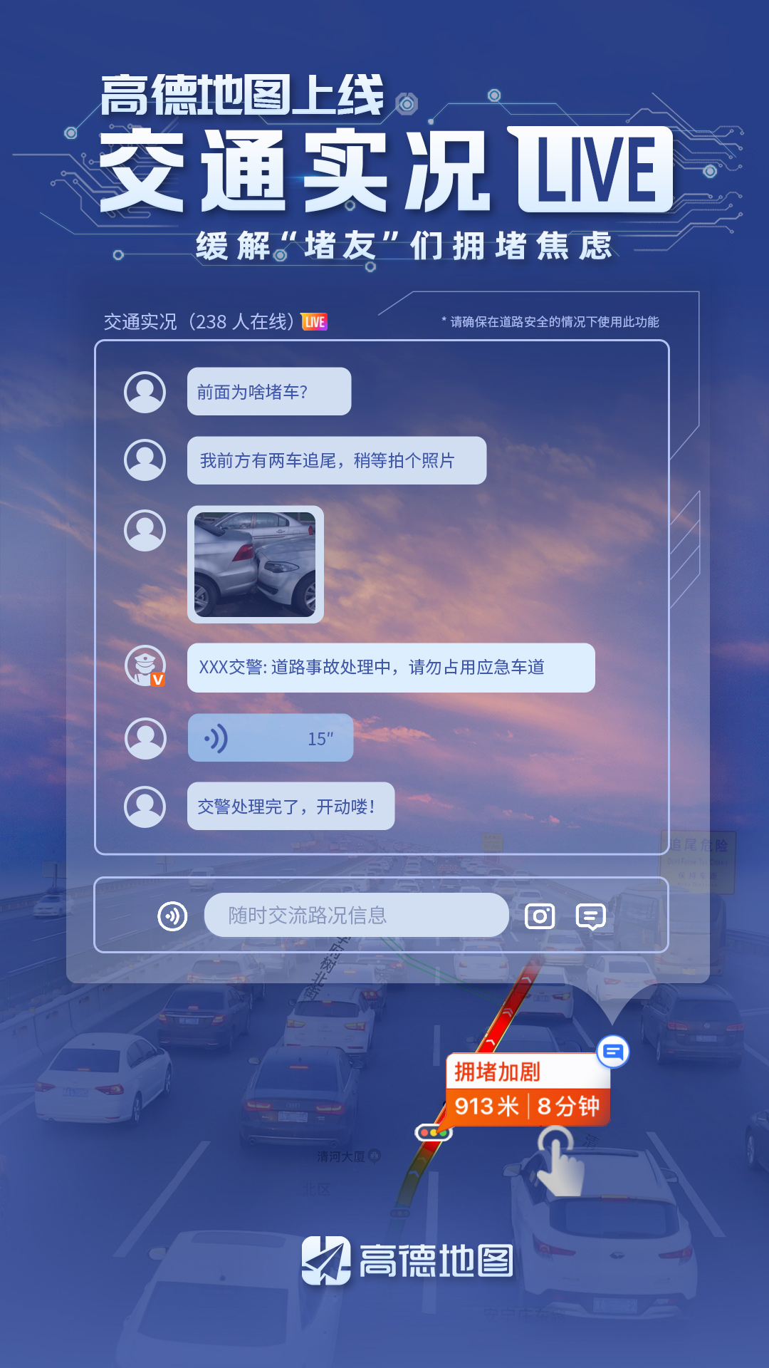 通過這個平臺,各地交管部門可及時發(fā)布擁堵事件的權(quán)威信息,如擁堵原因、派警情況、預(yù)計疏通用時及現(xiàn)場圖片等。當用戶進入嚴重擁堵路段時,通過點擊提醒氣泡即可進入該界面,實時了解擁堵信息。在車輛因堵車無法行進時,“堵友”們還可以互通有無,通過文字、語音、圖片等多種方式,為后方司機分享第一手信息。而當擁堵疏散時,“交通實況”功能也將自動關(guān)閉。