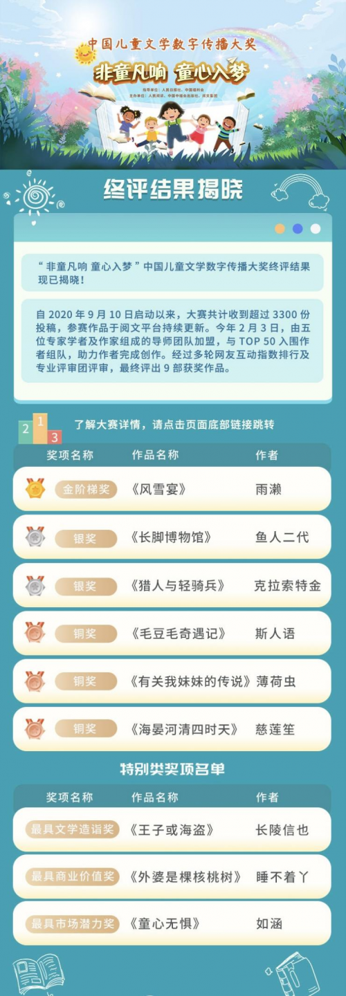 深圳新聞網(wǎng)2021年6月1日訊“非童凡響童心入夢(mèng)”中國(guó)兒童文學(xué)數(shù)字傳播大獎(jiǎng)6月1日揭曉終評(píng)結(jié)果,《風(fēng)雪宴》等9部參賽作品從3300余部作品中脫穎而出。大獎(jiǎng)終評(píng)頁(yè)面已在人民日?qǐng)?bào)數(shù)字傳播有限公司旗下“人民閱讀”平臺(tái)、中國(guó)中福會(huì)出版社、閱文集團(tuán)等平臺(tái)全面上線。