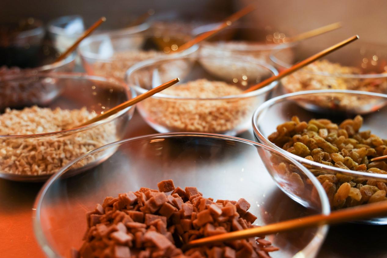除了產(chǎn)品口味、形式上的革新,探魚的lab店還新增了“DIY”專區(qū)。茶水、水果、涼菜、冰粉都可以在DIY區(qū)根據(jù)自己的口味隨意搭配,增加了消費者在用餐過程中的可玩性。值得一提的是,探魚的DIY冰粉取消了目前市場中常見的或固定或多樣的搭配方式,為消費者提供了3種冰粉基底,18種各色配料,搭配方式和用量全部由消費者自己選擇。不同口味質(zhì)地的配料為消費者提供了至少17000+種配比方式,這樣的設置潛在性地增加了用餐的社交功能,在整個就餐過程中,消費者被擁有了“體驗者”與“傳播者”的功能性身份,擁有了一場“就餐+游戲”的個性體驗。