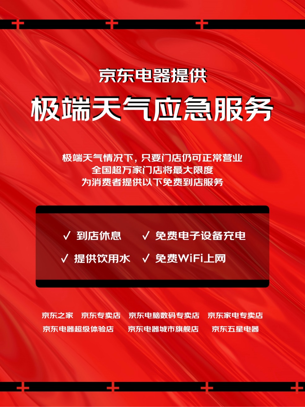京東電器第一時(shí)間推出了極端天氣應(yīng)急服務(wù),聯(lián)動(dòng)當(dāng)?shù)厝钥烧I(yíng)業(yè)的京東之家、京東專(zhuān)賣(mài)店、京東電腦數(shù)碼專(zhuān)賣(mài)店等線下門(mén)店,為市民提供汛情避險(xiǎn)場(chǎng)所和應(yīng)急服務(wù)。未來(lái)在遇到極端天氣的情況下,京東電器在全國(guó)的線下門(mén)店,包括京東之家、京東專(zhuān)賣(mài)店、京東電腦數(shù)碼專(zhuān)賣(mài)店、京東家電專(zhuān)賣(mài)店、京東電器超級(jí)體驗(yàn)店、京東電器城市旗艦店、京東五星電器等門(mén)店只要仍可正常營(yíng)業(yè),將最大限度為附近的消費(fèi)者提供到店休息、飲用水、電子設(shè)備充電、 WiFi上網(wǎng)等免費(fèi)應(yīng)急服務(wù)。
