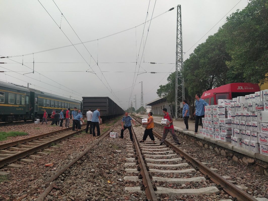 在第二批物資車(chē)隊(duì)駛出倉(cāng)庫(kù)的同時(shí),第三批滿載540多箱食品和礦泉水的京東物流車(chē)涉水抵達(dá)K226/7次列車(chē)臨時(shí)??康泥嵵蓁F爐站,為仍在滯留的數(shù)百名旅客送去應(yīng)急物資。