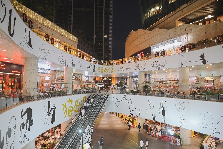 以壹方城為大型展廳,打造巨型貓瑜伽互動(dòng)點(diǎn)(B1中心廣場(chǎng))及巨型漫畫(huà)打卡墻 (小米通道前 ),全場(chǎng)還閃現(xiàn)各種創(chuàng)意貓貓漫畫(huà)貼紙,包括玻璃圍欄、店鋪櫥窗、電梯門(mén),甚至是小小垃圾桶也有細(xì)節(jié)設(shè)計(jì),沉浸式的“吸貓”逛展體驗(yàn),讓人獲得滿滿療愈之感。不得不說(shuō),貓出沒(méi) ·tango藝術(shù)特展實(shí)屬匠心之作,氛圍感和體驗(yàn)感極佳。