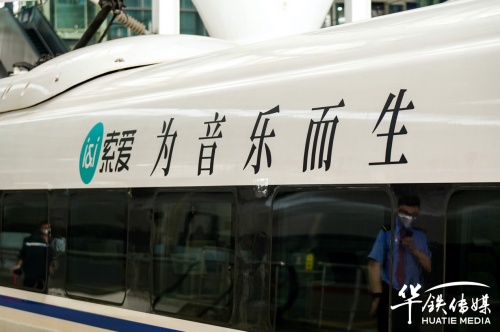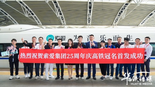 10月28日上午,索愛集團董事長劉建佳、總經理全雪梅、華鐵傳媒集團廣州分公司銷售總經理劉延群等領導嘉賓共同為冠名發(fā)車儀式揭幕、剪彩、互贈紀念禮品,在現場嘉賓的共同見證下,張貼索愛全新品牌代言人陳小春夫婦形象宣傳海報的“索愛-為音樂而生”高鐵冠名列車正式啟程。