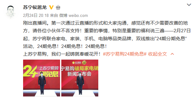 2月24日晚8點(diǎn),一場(chǎng)特殊的線上發(fā)布會(huì)在蘇寧矩陣直播平臺(tái)全面啟動(dòng)。蘇寧侯恩龍化身主播,宣布開啟一場(chǎng)公司復(fù)工與市場(chǎng)復(fù)蘇的“救市”行動(dòng),拉開家電銷售破局大幕。