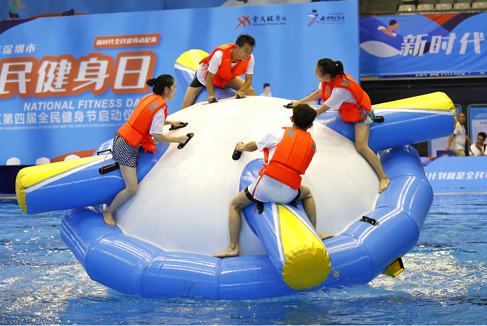 啟動儀式結束后,現場的泳池內還開展了全民運動薈板塊的水上趣味運動會項目。