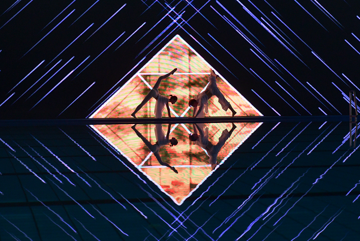 啟動儀式在數字舞美《極魅之光》中開啟,作為首次在游泳館內舉行的開幕式,平靜的水面倒映著變幻的光影和舞姿,精彩的表演贏得了現場觀眾的熱烈掌聲。