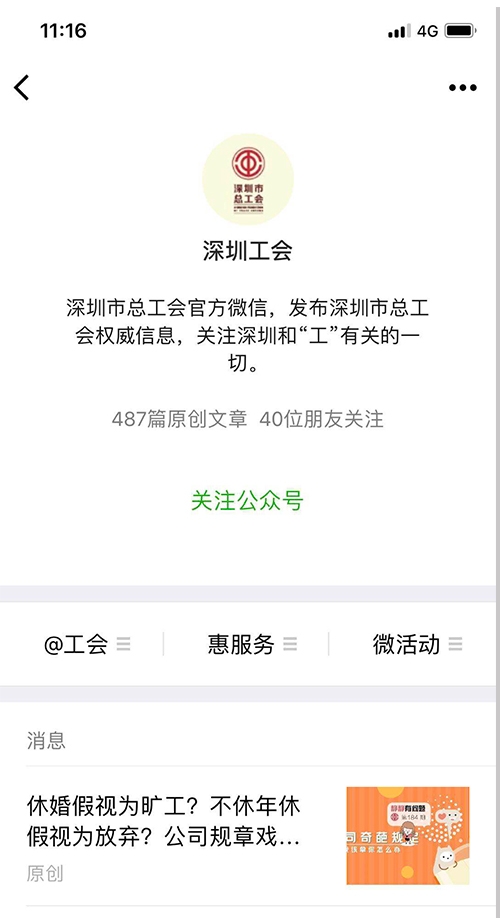 案例介紹:“深圳工會”是深圳市總工會官方自媒體,2015年上線,目前用戶數(shù)20萬。致力于打造集“工會發(fā)聲平臺”“工會工作者掌上寶典”“指尖上的職工之家”為一體的新媒體平臺。堅(jiān)持以職工為中心,體現(xiàn)工會特色,運(yùn)用“互聯(lián)網(wǎng)+工會”思維,遵循新媒體傳播規(guī)律,突出公益性、服務(wù)性,采取社會化運(yùn)營方式,整合資源,與知名媒體聯(lián)動,注重實(shí)用性和互動性。適應(yīng)職工需求,開展豐富的線上線下活動,活動參與人次達(dá)500萬。作為深圳工會新媒體的龍頭,積極提供業(yè)務(wù)指導(dǎo)和技術(shù)支撐,形成覆蓋百萬職工的工會新媒體矩陣。