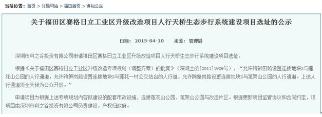 而據(jù)資料記載,市規(guī)土委曾經(jīng)在2015年4月10日,在福田管理局官網(wǎng)上發(fā)布了《關(guān)于福田區(qū)賽格日立工業(yè)區(qū)升級改造項目人行天橋生態(tài)步行系統(tǒng)建設(shè)項目選址的公示》,其中明確提到“根據(jù)《關(guān)于福田區(qū)賽格日立工業(yè)區(qū)升級改造專項規(guī)劃(調(diào)整方案)的批復(fù)》(深規(guī)土函[2011]1929號),‘允許跨彩田路設(shè)置連接地塊2與蓮花山公園的人行通道,允許跨筍崗路設(shè)置連接地塊2與蓮花一村公交站臺的人行道,允許跨皇崗路設(shè)置連接地塊2與筆架山公園的人行通道。上述人行通道須全天候?yàn)楣婇_放’?!?/p>