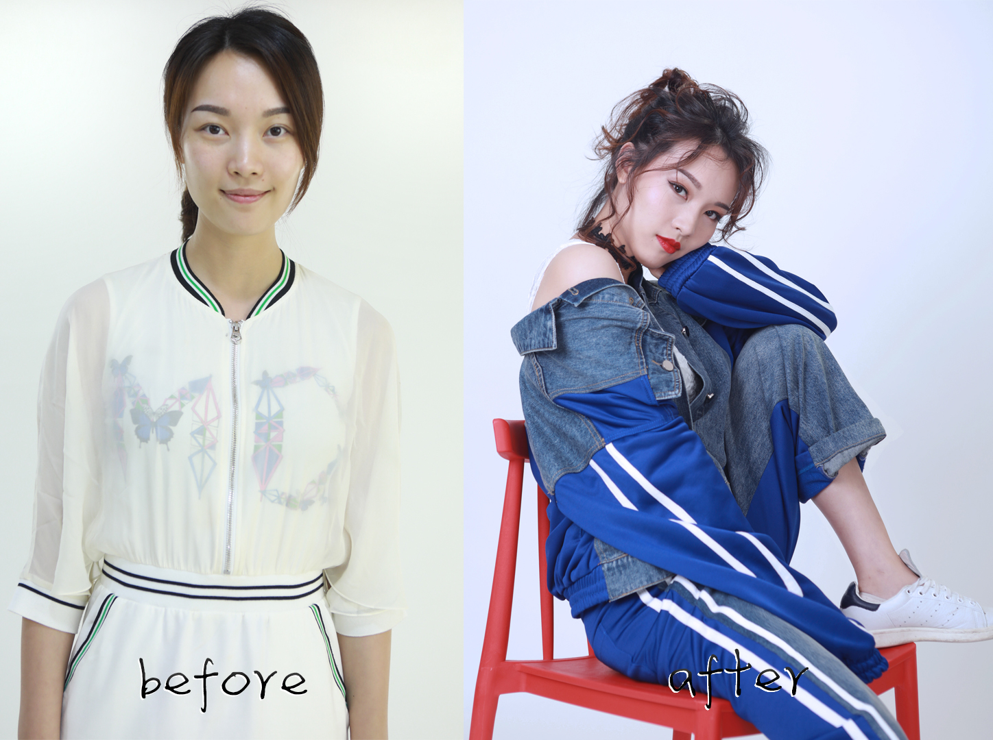 改造前后的芷苑小姐姐。從妝發(fā)上找到了五官和臉型的個性,服裝上選擇了牛仔最擅長的街頭風(fēng)格。從一個清新的辦公室女孩,變成了時髦街頭酷女孩。
