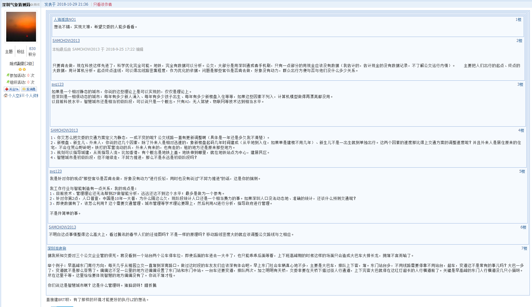 9月25日有市民在深圳論壇以《關(guān)于公交線路規(guī)劃和站臺(tái)設(shè)置的一點(diǎn)建議》為題發(fā)帖,自稱是曾經(jīng)的公交人和現(xiàn)在的私家車駕駛員,對(duì)深圳的公交出行一口氣提出3個(gè)意見(jiàn)。帖文中最為吸引人眼球的觀點(diǎn)就是“將全市各站點(diǎn)進(jìn)行編號(hào),采用計(jì)算機(jī)技術(shù),對(duì)編號(hào)站點(diǎn)進(jìn)行排列組合,每個(gè)方向連續(xù)的10個(gè)站點(diǎn)有三條線路覆蓋,超出三條屬于線路密度高或規(guī)劃不合理?!眴芜@一句話就在跟帖中引發(fā)了針?shù)h相對(duì)的辯論,有支持的市民認(rèn)為:主意不錯(cuò),實(shí)現(xiàn)起來(lái)應(yīng)該也難度不大?,F(xiàn)在不是整天提什么物聯(lián)網(wǎng)、大數(shù)據(jù)、智慧城市么,這個(gè)不就是這些高新技術(shù)在公交出行方面的應(yīng)用。不看好的市民則認(rèn)為:目前技術(shù)、管理理論還無(wú)法做智能分析,遠(yuǎn)遠(yuǎn)還達(dá)不到這個(gè)水平,“最多是做為一個(gè)參考”。