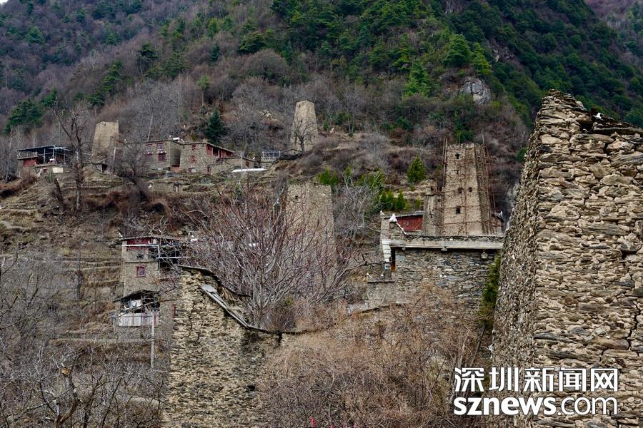 黑虎羌寨古稱“黑貓寨”,修建于唐代以后。是當?shù)匾恢甲逍〔柯錇榈钟练謹_建起來的“邛籠”(石砌碉樓)。古寨中現(xiàn)在留存高高矗立的十一座羌碉,保持著當年風煙滾滾的御敵氣勢。李仁奇 攝