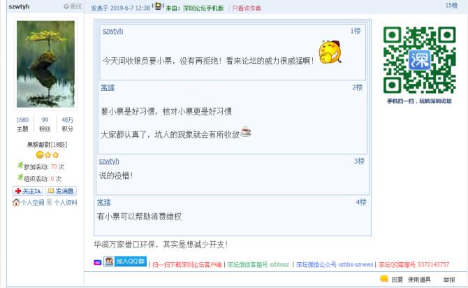 記者從問政平臺得知,5月底以來,還有市民發(fā)帖反映,除華潤萬家外,科技園萬象天地華潤Ole、僑香路沃爾瑪?shù)瘸幸泊嬖诓惶峁┘堎|(zhì)購物小票的情況。目前,市民仍然普遍認同超市應主動提供紙質(zhì)購物小票,避免顧客被價格欺詐。有市民表示:“遇到最多的是優(yōu)惠打折,實際還是原價買單,這時,手中有小票一目了然,不花冤枉錢?!边€有市民質(zhì)疑,“奸商,動不動就打著環(huán)保這些高大上的理由作借口”。同時,也有市民體驗過微信小票后表示,“沃爾瑪手機掃碼付款是沒有紙票,購物小票藏在微信公眾號里,退換貨就在那里面進行。這就是科技發(fā)達帶來的豐碩成果,挺好的?!苯刂劣浾甙l(fā)稿時,市民關于科技園萬象天地華潤Ole、僑香路沃爾瑪?shù)瘸胁惶峁┵徫镄∑钡奶倪€沒有得到相關部門回應。