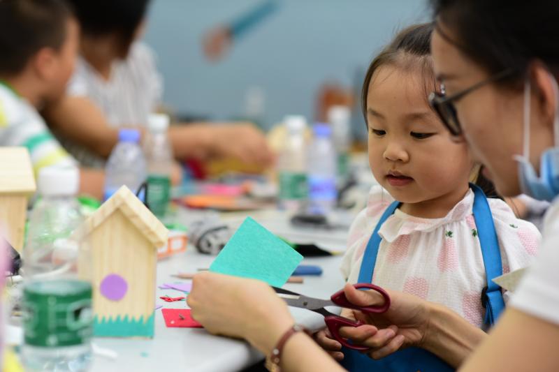 如果說搭建音樂盒的結(jié)構(gòu)最能鍛煉孩子們的動手能力,那么為音樂盒裝飾外觀則是任由小朋友們想象力馳騁的舞臺。天馬行空的涂抹、充滿創(chuàng)意的顏色搭配,每一個細(xì)節(jié)都閃耀著童真童趣?!皨寢屇懵牥。@比我們家的那個音樂盒好聽多啦。”拿著自己親手制作的木工音樂盒,聽著清亮的音樂聲,一位小朋友滿意的跟自己的母親分享著喜悅。