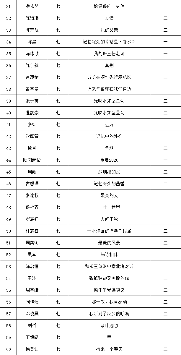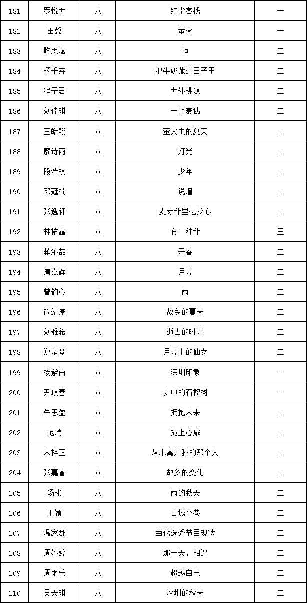 自2021年1月,活動征稿啟動以來,獲得了深圳市廣大中小學(xué)生、教師、文學(xué)愛好者的熱烈響應(yīng)積極參與,吸引了深圳百余所學(xué)校的上萬人關(guān)注報名?,F(xiàn)公布龍華區(qū)外國語學(xué)校專場晉級復(fù)賽名單如下: