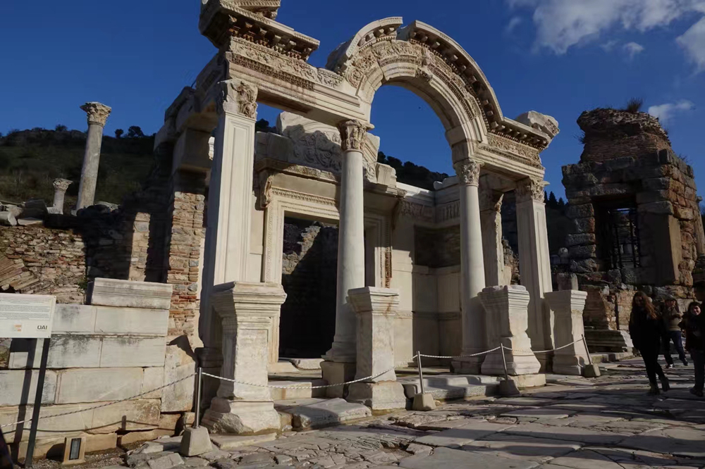 在以弗所古城遺址可以看到用大理石修建的街道、商店、市集、圖書館、柱廊大街、哈德良神殿、劇場、浴場、妓院等遺跡。走進(jìn)古城猶如穿過時光隧道,可以遙想2900多年前這座城市的繁盛情景。李仁奇 攝