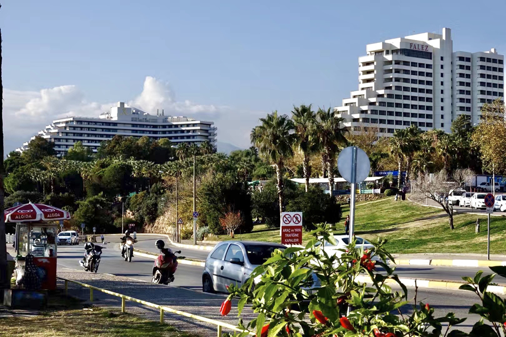 安塔利亞被群山環(huán)繞,成行的棕櫚樹(shù)構(gòu)成一條條林蔭大道,西面是一望無(wú)際的拉拉沙灘,南瀕清澈的地中海,北臨郁郁叢叢的托羅斯山脈。市區(qū)人口約60萬(wàn),每年夏季有大量游客,特別是俄羅斯人涌入。李仁奇 攝