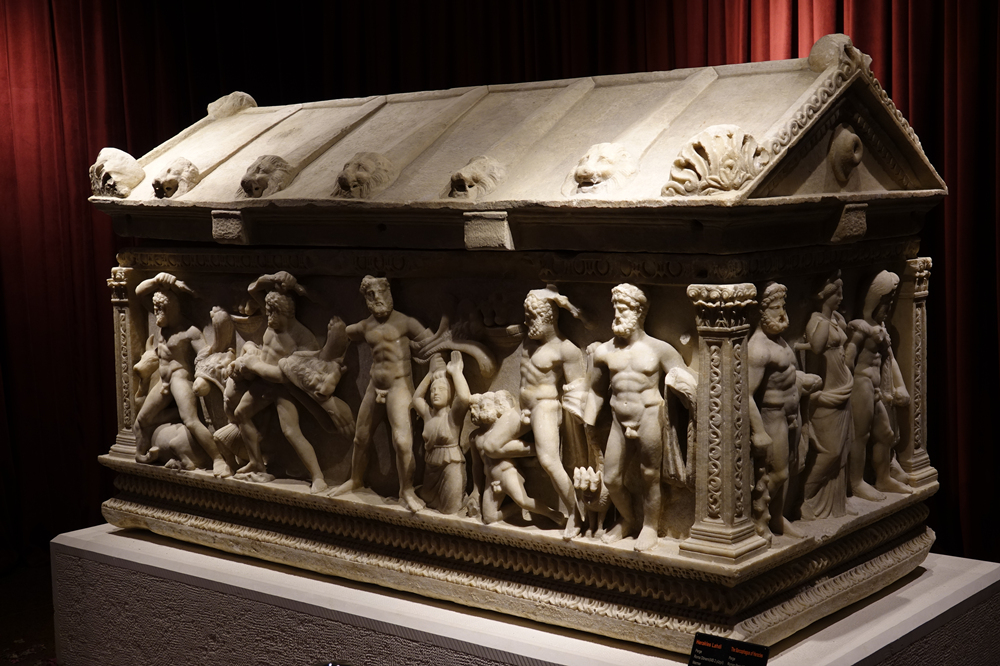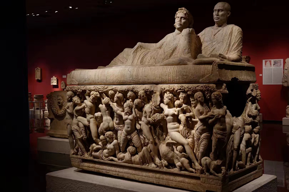 赫拉克勒斯石棺,它的側(cè)立面描繪赫拉克勒斯斬殺九頭蛇、與獅子搏斗、偷盜金蘋果等12項(xiàng)苦力后升為神的傳奇故事,浮雕保存完整、栩栩如生,展現(xiàn)了古羅馬精湛的雕塑工藝。李仁奇 攝
