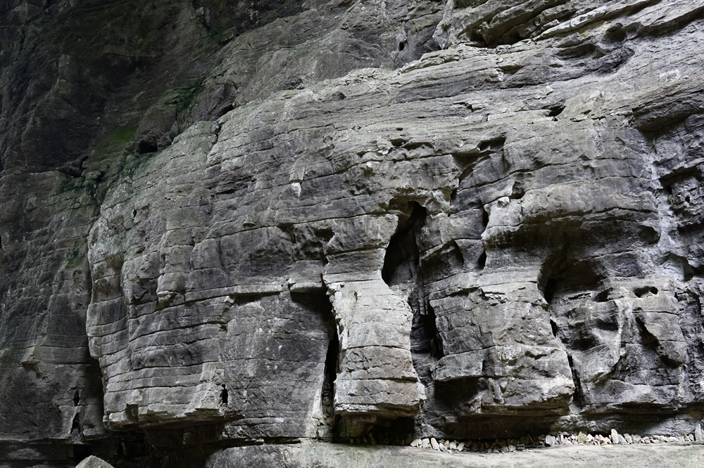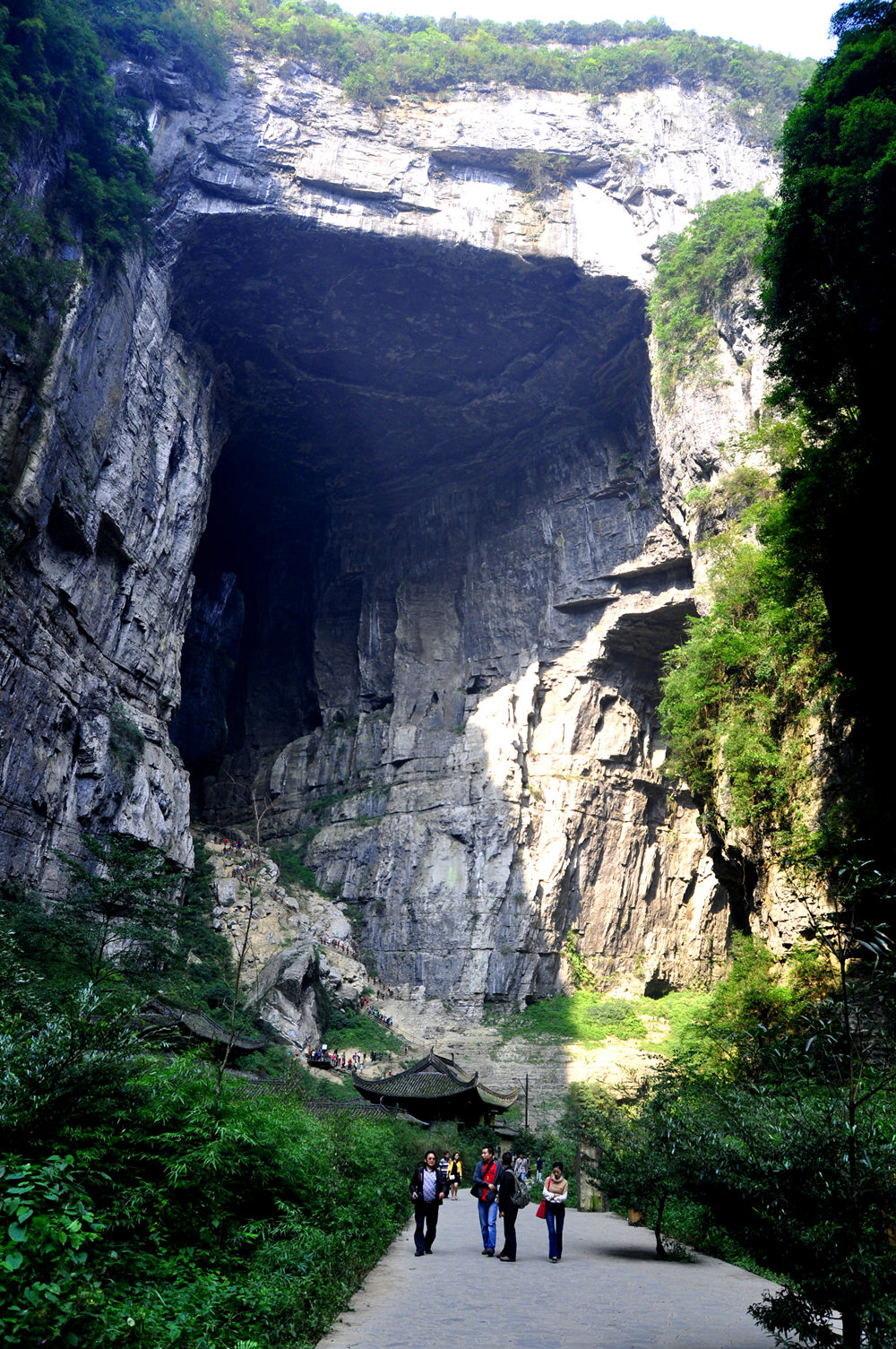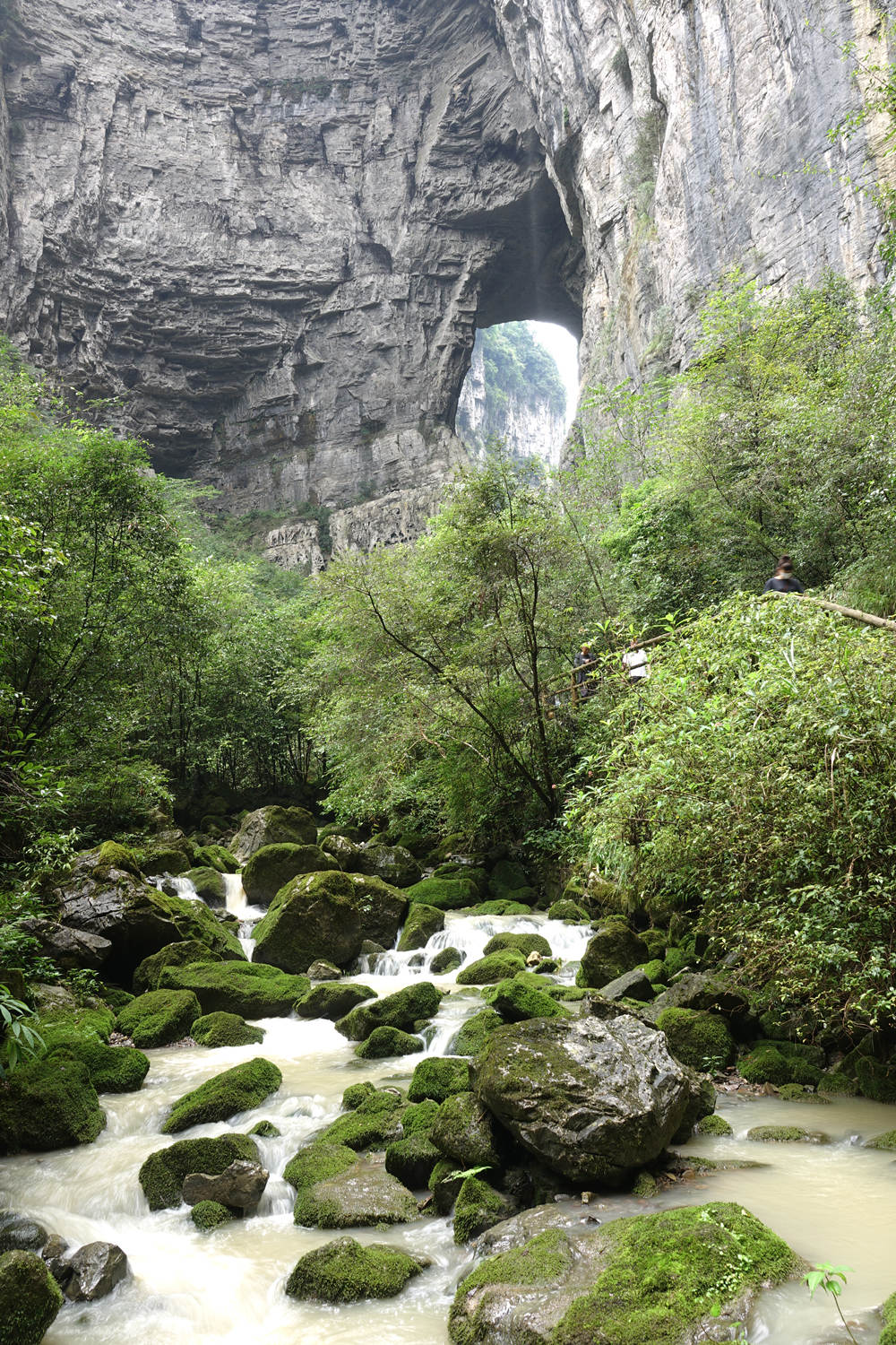 黑龍橋?yàn)檠蛩訊{谷上位置最下游的天生橋,因其拱洞幽深暗黑,似有一條黑龍蜿蜒于洞頂而得名。橋厚107m,拱孔跨度16-49m,橋面寬達(dá)193m,為三橋中寬度最大者。李仁奇 攝