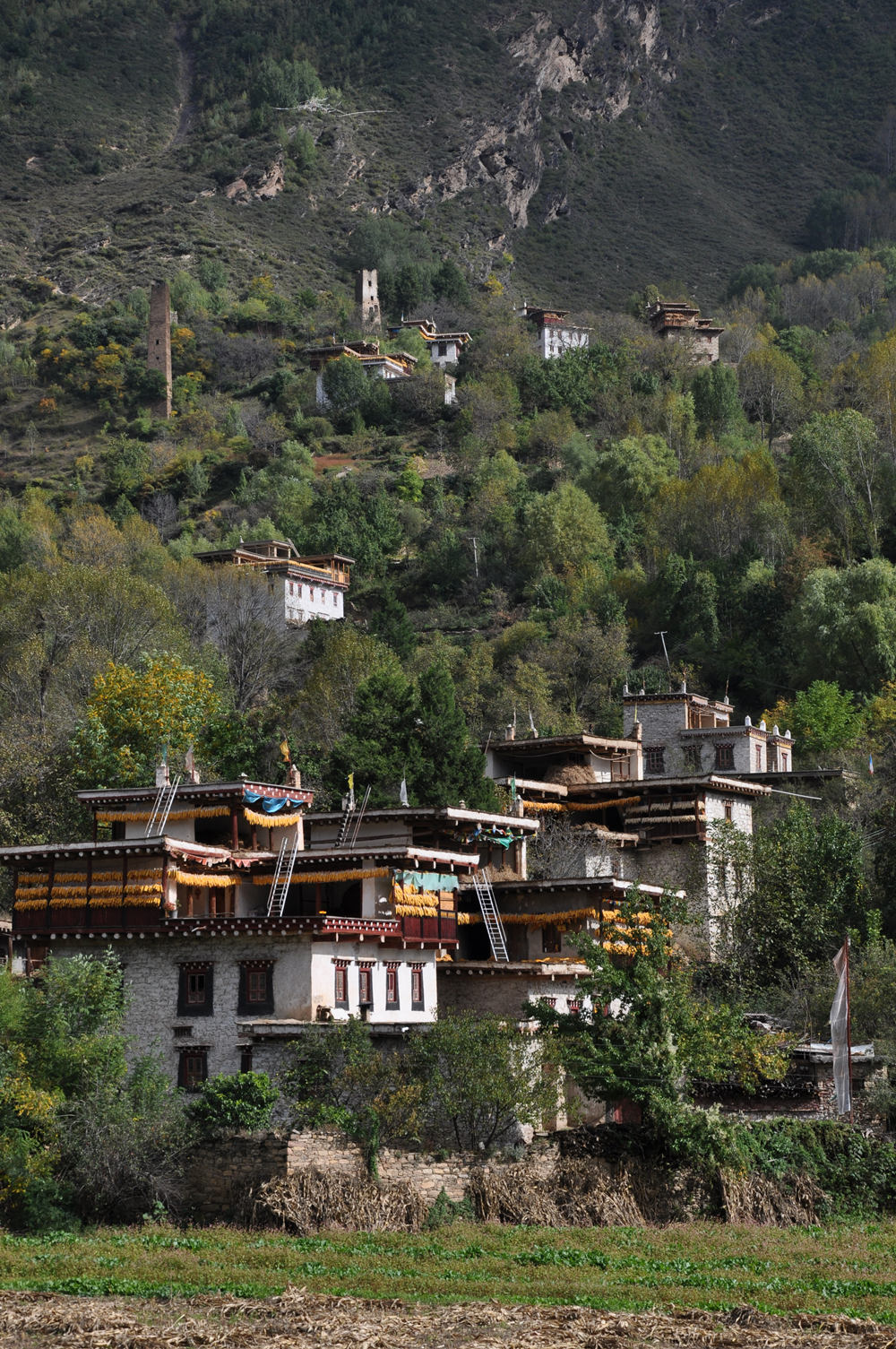 嘉絨藏民多居住在河谷或半山向陽的寨子里。自古以來,他們建就地取材建房,用黃泥作粘合劑,以石塊砌墻,以巨木為梁,橫搭雜木,蓋土于上,堅(jiān)固不漏。李仁奇 攝
