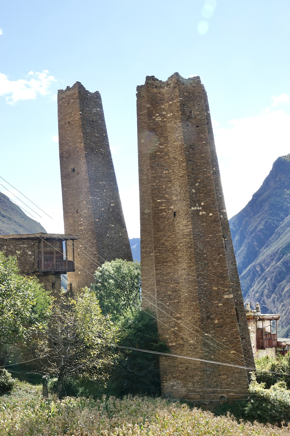 古碉為片石或石塊夾泥砌成,棱角筆直,墻面光滑,下寬上窄,一般高20余米,最高達50米,內(nèi)建樓層十余層至二十余層,每層可容納10余人。李仁奇 攝