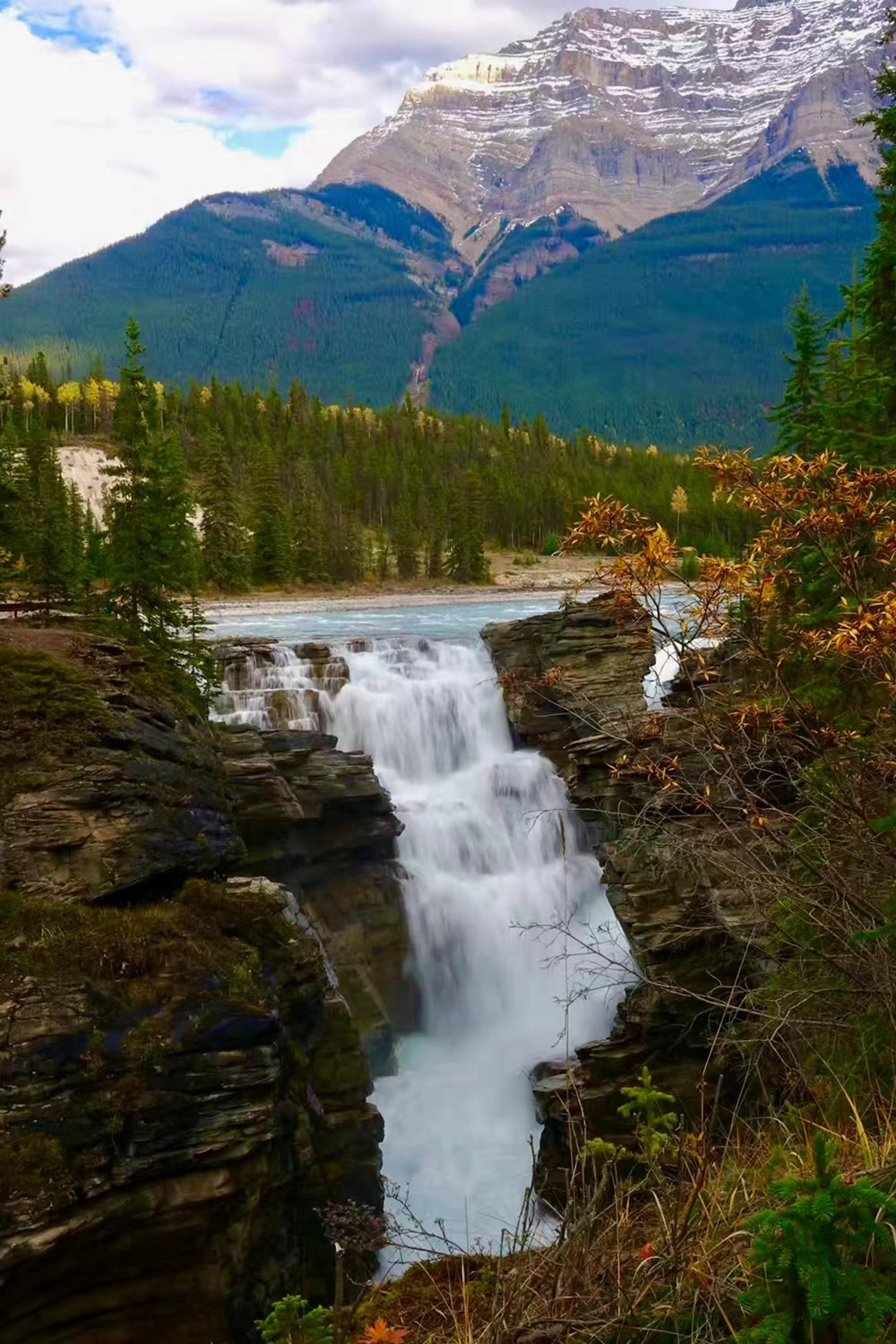 哥倫比亞冰原的融水匯成了阿薩巴斯卡河,由南向北至賈斯珀附近跌落至二三十米的斷崖,形成了這萬馬奔騰般的阿薩巴斯卡瀑布。李仁奇 攝