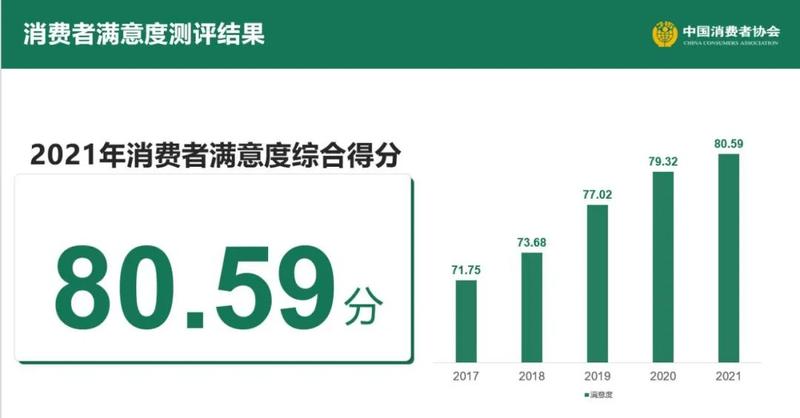 測評結(jié)果顯示,2021年度100個城市消費(fèi)者滿意度綜合得分為80.59分,較2020年提高1.27分,且首次突破80分。