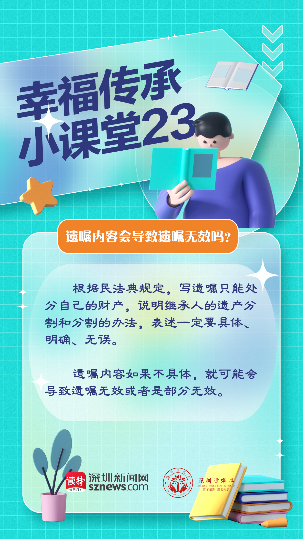 今天,由深圳遺囑庫與深圳新聞網(wǎng)聯(lián)合制作的幸福傳承小課堂第23期,我們就來說說,遺囑什么情況下可能無效。根據(jù)民法典規(guī)定,寫遺囑只能處分自己的財(cái)產(chǎn),說明繼承人的遺產(chǎn)分割和分割的辦法,表述一定要具體、明確、無誤。遺囑內(nèi)容如果不具體,就可能會(huì)導(dǎo)致遺囑無效或者是部分無效。因此,李大爺不能將財(cái)產(chǎn)的全部都給到后老伴,法院也判定了這份遺囑是部分無效的。