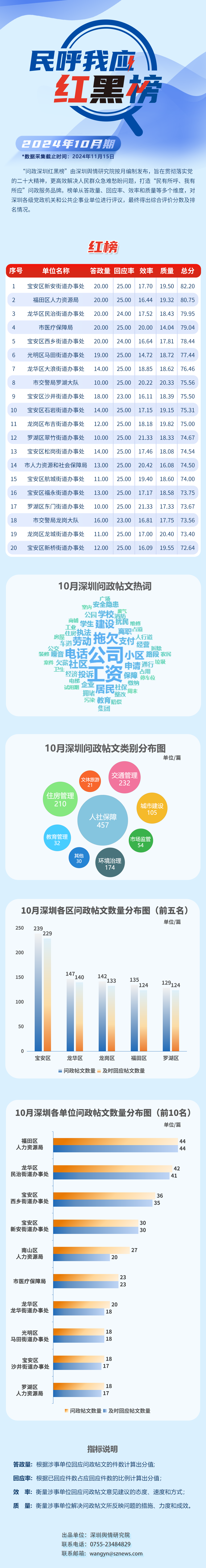 本期榜單采集的帖文主要來自深圳市及各區(qū)政府官網(wǎng)、深圳論壇、人民網(wǎng)領(lǐng)導(dǎo)留言板、深圳新聞網(wǎng)“民呼我應(yīng)”等平臺,所采集帖文發(fā)布時間為2024年10月1日至10月31日,采集截止時間為2024年11月15日。
