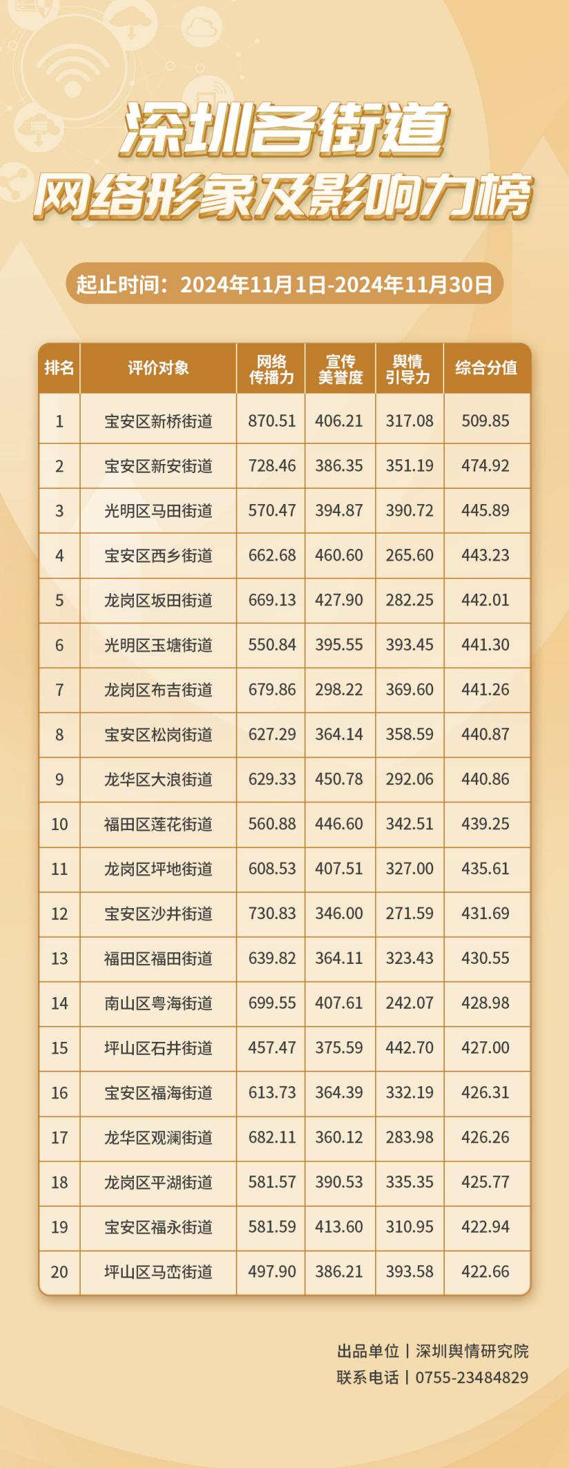 2024年11月,共有20個街道登上《深圳各街道網(wǎng)絡形象及影響力榜》,分別是:寶安區(qū)新橋街道、寶安區(qū)新安街道、光明區(qū)馬田街道、寶安區(qū)西鄉(xiāng)街道、龍崗區(qū)坂田街道、光明區(qū)玉塘街道、龍崗區(qū)布吉街道、寶安區(qū)松崗街道、龍華區(qū)大浪街道、福田區(qū)蓮花街道、龍崗區(qū)坪地街道、寶安區(qū)沙井街道、福田區(qū)福田街道、南山區(qū)粵海街道、坪山區(qū)石井街道、寶安區(qū)福海街道、龍華區(qū)觀瀾街道、龍崗區(qū)平湖街道、寶安區(qū)福永街道、坪山區(qū)馬巒街道。