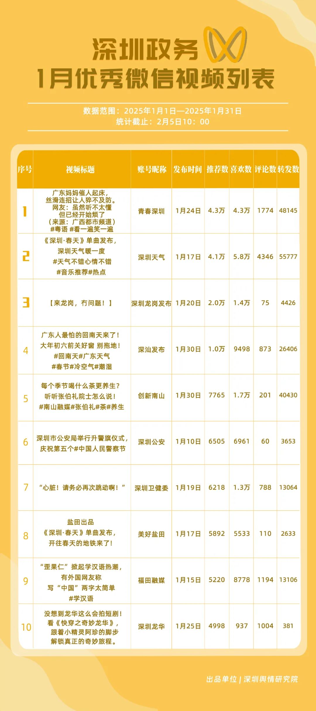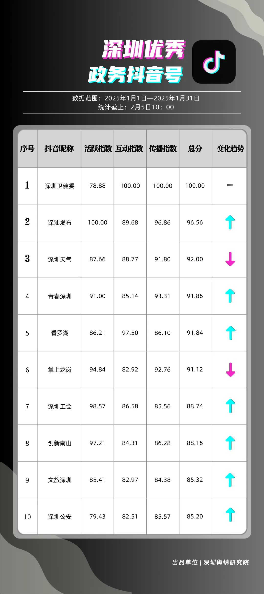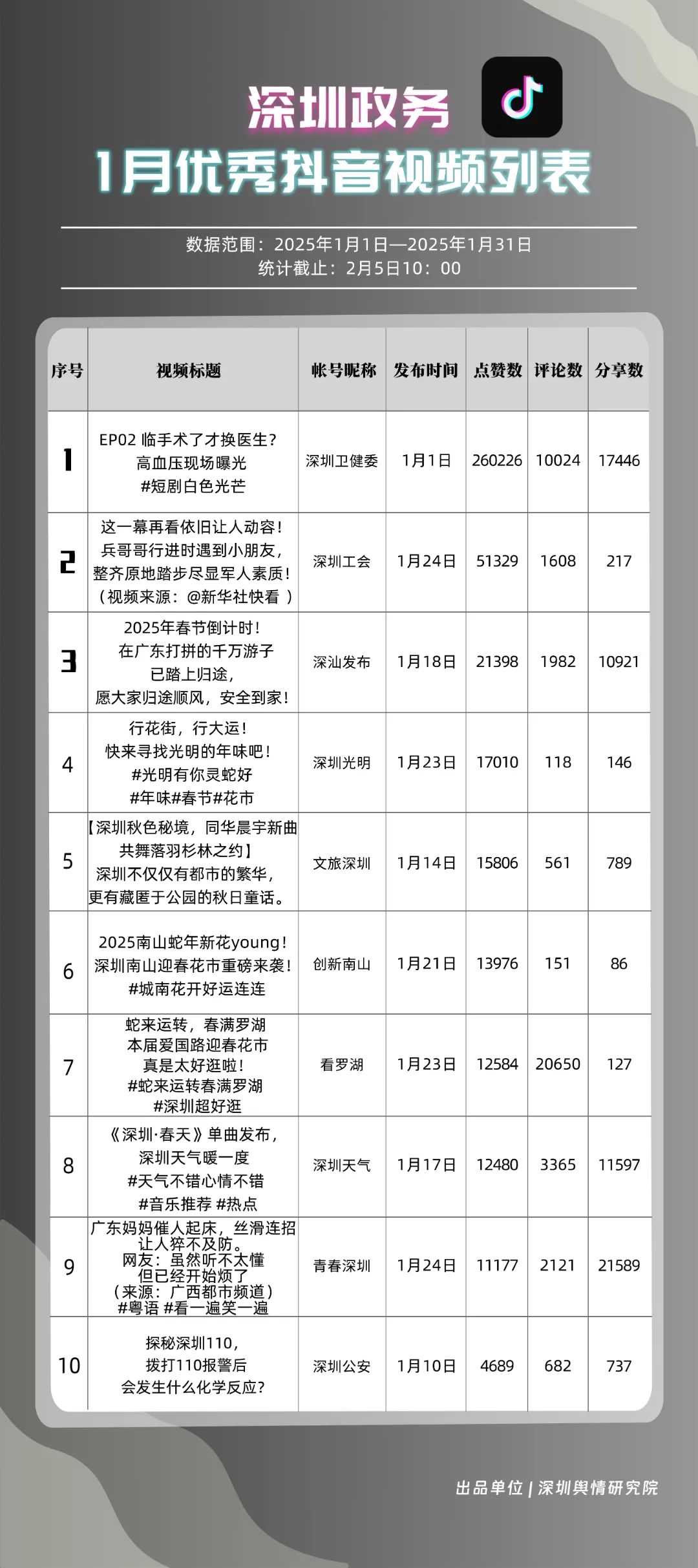 1月,“深圳衛(wèi)健委”“深汕發(fā)布”“深圳天氣”“青春深圳”“看羅湖”“掌上龍崗”“深圳工會”“創(chuàng)新南山”“文旅深圳”“深圳公安”共10個政務(wù)抖音號獲得“深圳優(yōu)秀政務(wù)抖音號”稱號?!吧钲谛l(wèi)健委”“深汕發(fā)布”“深圳天氣”成績優(yōu)異,綜合實(shí)力較強(qiáng),位于榜單前列。“青春深圳”“看羅湖”等賬號排名有所提升,彰顯了這些賬號在拓寬受眾基礎(chǔ)、增強(qiáng)用戶黏性等方面所取得的積極成效。