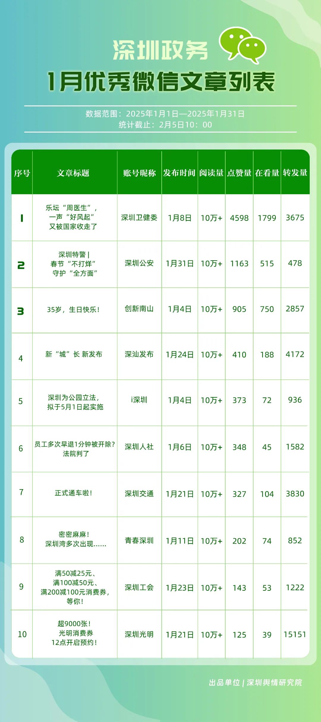 2025年1月期《深圳優(yōu)秀政務(wù)新媒體矩陣》發(fā)布,一同揭曉哪些政務(wù)新媒體矩陣能夠憑借其卓越表現(xiàn)脫穎而出,成為推動政務(wù)信息傳播與服務(wù)模式創(chuàng)新的領(lǐng)航者,引領(lǐng)政務(wù)新媒體運(yùn)營邁向新高度。