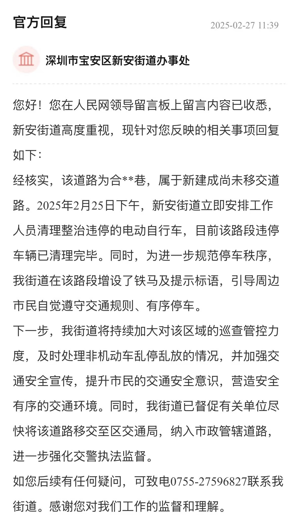 案例點評:非機動車亂停放影響交通和消防安全,嚴重影響市民生活。街道辦行動迅速,第一時間清理違停車輛,增設(shè)鐵馬及提示標語,規(guī)范停車秩序,展現(xiàn)了高效的處置能力?;貞?,街道還制定了長效治理計劃,構(gòu)建“短期整治+長效管理”模式,有助于解決區(qū)域交通問題,提升城市管理水平。