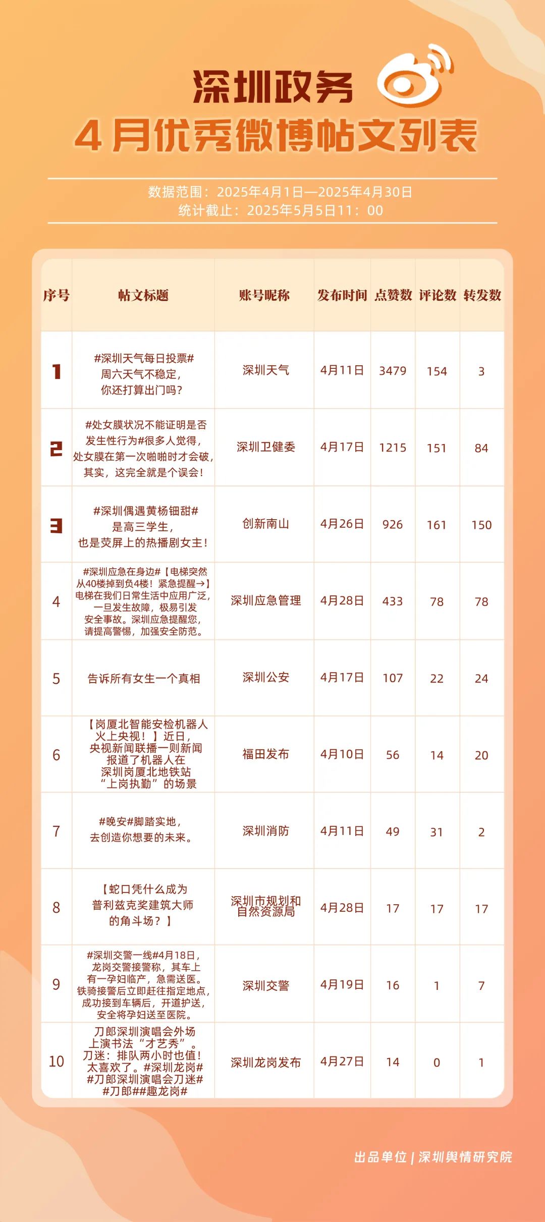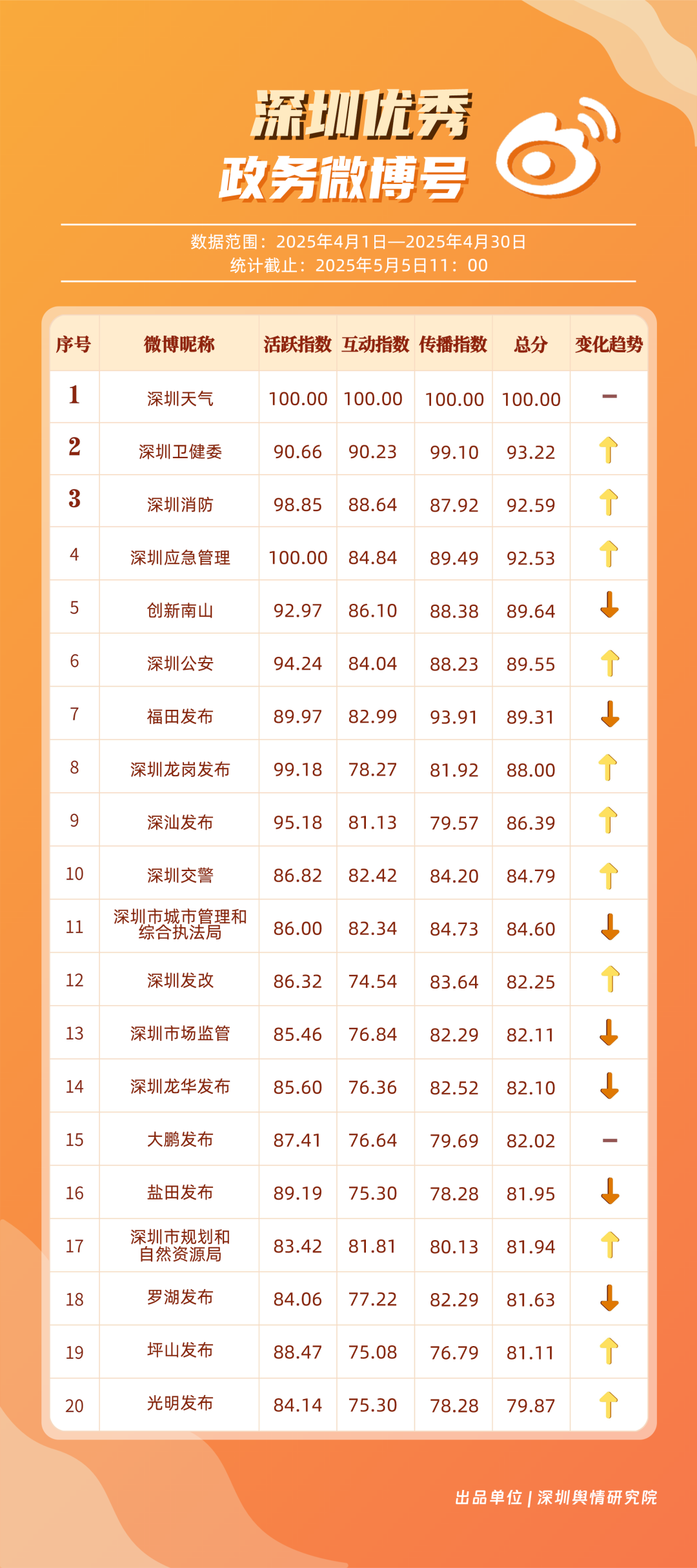 4月,“深圳天氣”“深圳衛(wèi)健委”“深圳消防”“深圳應(yīng)急管理”“創(chuàng)新南山”“深圳公安”“福田發(fā)布”“深圳龍崗發(fā)布”“深汕發(fā)布”“深圳交警”等20個(gè)賬號(hào)入選“優(yōu)秀政務(wù)微博號(hào)”。值得一提的是,“深圳天氣”在多個(gè)指標(biāo)中獲得滿(mǎn)分,其氣象信息的趣味性和實(shí)用性受到市民認(rèn)可;“深圳衛(wèi)健委”“深圳消防”“深圳應(yīng)急管理”也在信息傳播、互動(dòng)服務(wù)等方面持續(xù)發(fā)力,以超過(guò)90分的總分緊跟其后;“深汕發(fā)布”“深圳交警”相較于3月在榜單排名有所提升,展現(xiàn)出強(qiáng)勁的發(fā)展勢(shì)頭。這些優(yōu)秀政務(wù)微博號(hào)的脫穎而出,不僅體現(xiàn)了各自的運(yùn)營(yíng)實(shí)力,更反映出深圳政務(wù)新媒體在微博平臺(tái)的蓬勃發(fā)展態(tài)勢(shì)。
