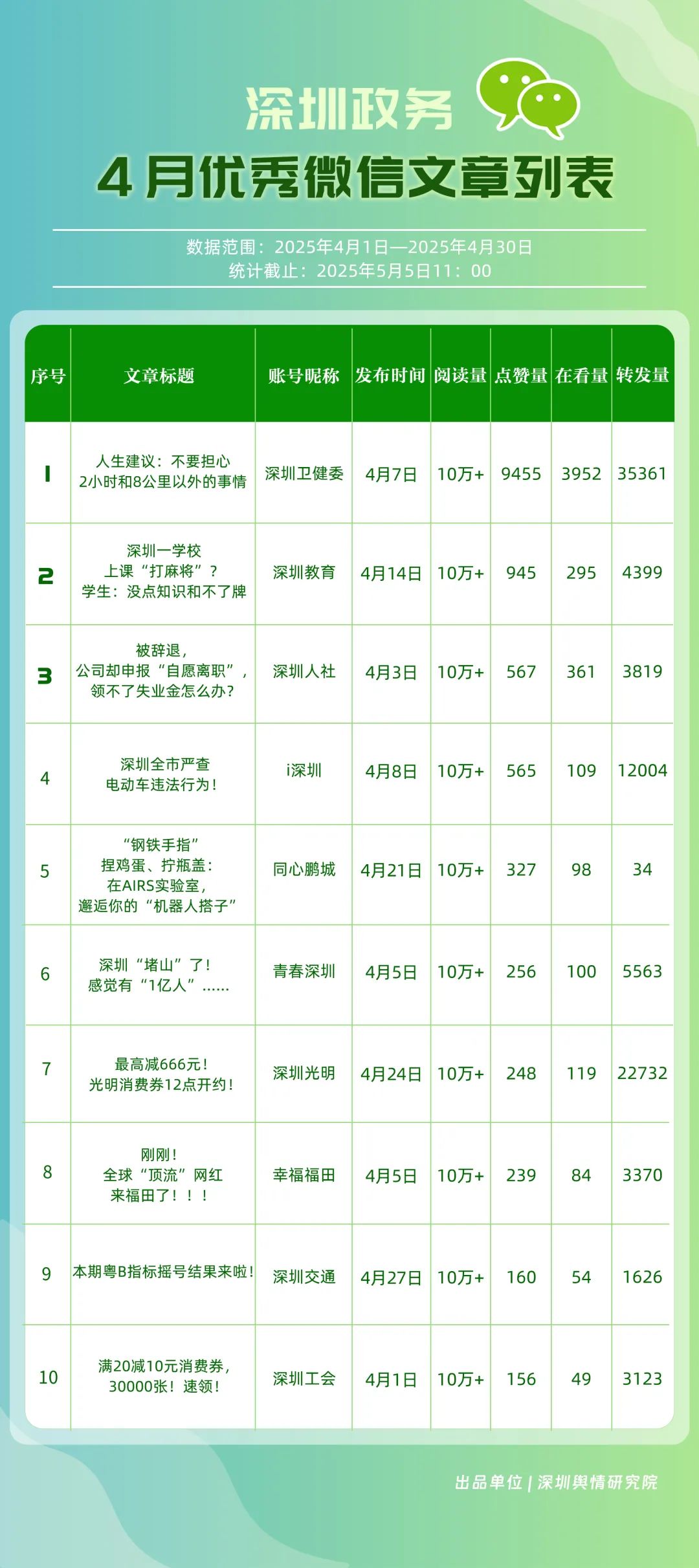 4月,包括“深圳衛(wèi)健委”“深圳龍崗發(fā)布”“幸福福田”“深圳光明”“i深圳”“創(chuàng)新南山”“青春深圳”“深圳交通”“深圳教育”“濱海寶安”等在內(nèi)的30個(gè)賬號(hào)入選“深圳優(yōu)秀政務(wù)微信公眾號(hào)”。其中,“深圳衛(wèi)健委”在活躍指數(shù)、互動(dòng)指數(shù)、傳播指數(shù)上均拿到滿(mǎn)分,4月共有67篇推文閱讀量超10萬(wàn)次,綜合得分穩(wěn)居榜單首位;“深圳龍崗發(fā)布”同樣表現(xiàn)亮眼,4月共產(chǎn)出13篇閱讀量超10萬(wàn)次的爆款文章,綜合得分排名第二位;“幸福福田”則憑借持續(xù)輸出的高質(zhì)量?jī)?nèi)容,排在榜單第三位?!吧钲诠饷鳌薄癷深圳”“創(chuàng)新南山”“青春深圳”也憑借扎實(shí)的內(nèi)容功底與良好的運(yùn)營(yíng)策略,總分超85分。上榜賬號(hào)的亮眼成績(jī),不僅彰顯了各自的傳播優(yōu)勢(shì),更展現(xiàn)出各新媒體矩陣在微信公眾平臺(tái)的傳播勢(shì)能正持續(xù)攀升。