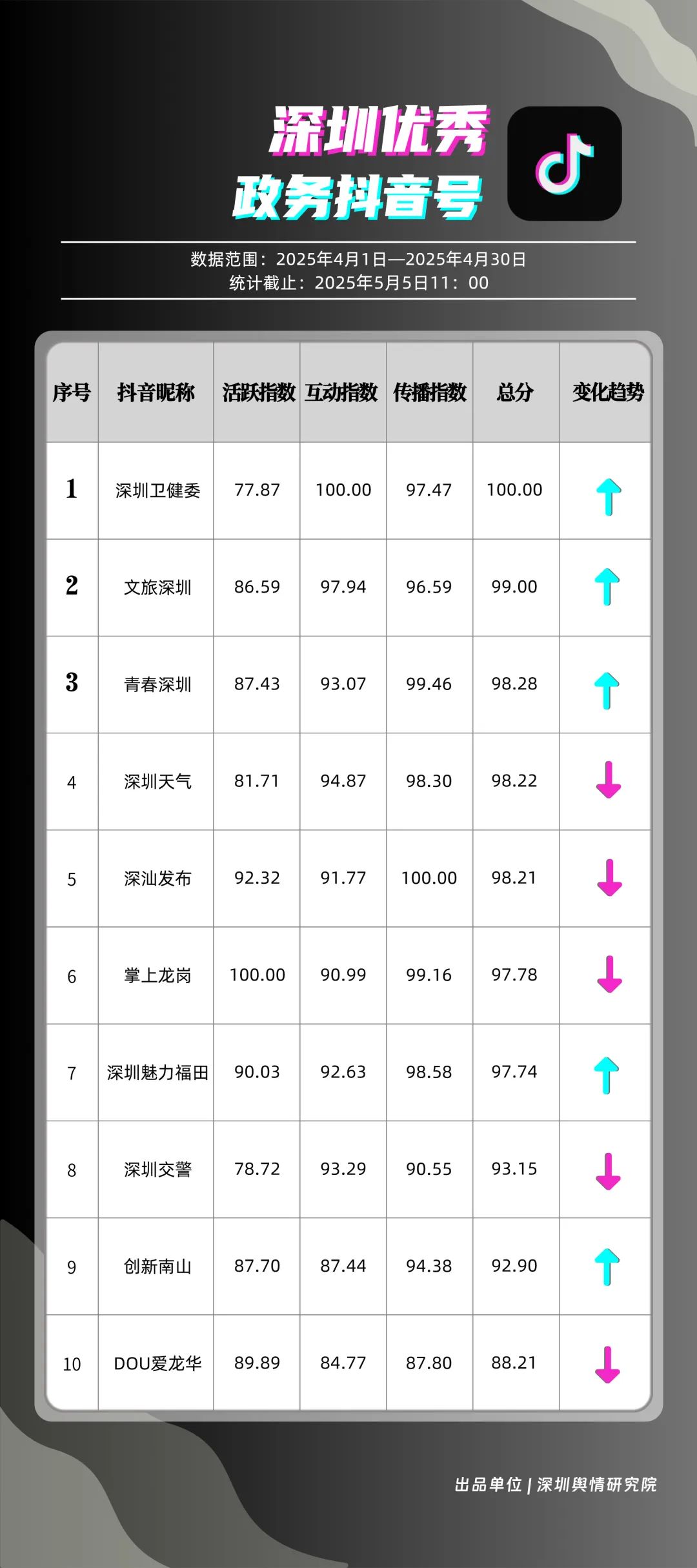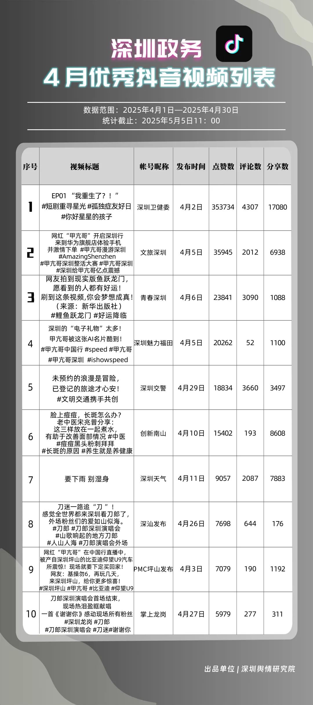 4月,“深圳衛(wèi)健委”“文旅深圳”“青春深圳”“深圳天氣”“深汕發(fā)布”“掌上龍崗”“深圳魅力福田”“深圳交警”“創(chuàng)新南山”“DOU愛(ài)龍華”共10個(gè)政務(wù)抖音號(hào)獲得“優(yōu)秀政務(wù)抖音號(hào)”稱(chēng)號(hào)。4月,“深圳衛(wèi)健委”“文旅深圳”“青春深圳”憑借新穎的內(nèi)容策劃、生動(dòng)的短視頻呈現(xiàn)方式,實(shí)現(xiàn)排名提升,位居榜單前三。“深圳天氣”“深汕發(fā)布”緊隨其后,以?xún)?yōu)質(zhì)實(shí)用的內(nèi)容、接地氣的表達(dá),持續(xù)擴(kuò)大政務(wù)新媒體的傳播聲量。上榜賬號(hào)積極探索創(chuàng)新傳播路徑,以生動(dòng)有趣的方式傳遞政務(wù)信息,為深圳政務(wù)新媒體在短視頻領(lǐng)域的發(fā)展注入新活力。