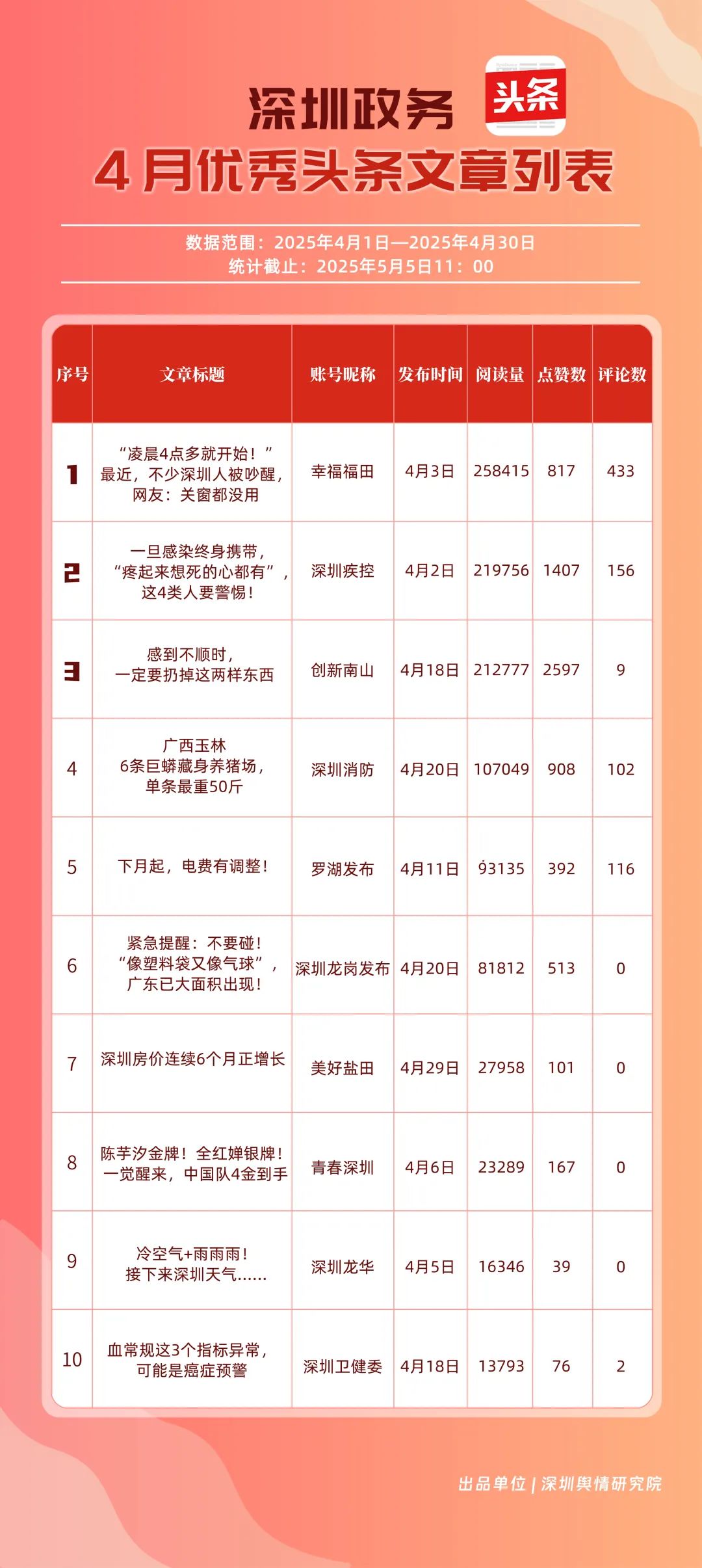 4月,“幸福福田”“深圳疾控”“創(chuàng)新南山”“深圳消防”“羅湖發(fā)布”“深圳龍崗發(fā)布”“坪山發(fā)布”“深圳龍華”“青春深圳”“濱海寶安”共10個(gè)政務(wù)頭條號(hào)入選“優(yōu)秀政務(wù)頭條號(hào)”榜單?!靶腋8L铩毖永m(xù)上月的優(yōu)異表現(xiàn),以?xún)?yōu)質(zhì)的內(nèi)容輸出和穩(wěn)定的用戶(hù)互動(dòng),位列榜單首位,成為政務(wù)頭條號(hào)的標(biāo)桿;“深圳疾控”則以92.39分的亮眼成績(jī)排在榜單第二位,凸顯了政務(wù)新媒體在公共衛(wèi)生領(lǐng)域的傳播成果;“創(chuàng)新南山”“深圳消防”“羅湖發(fā)布”緊隨其后,分別在城區(qū)形象宣傳、消防安全領(lǐng)域等方面深耕細(xì)作,持續(xù)擴(kuò)大政務(wù)信息的覆蓋面與影響力。