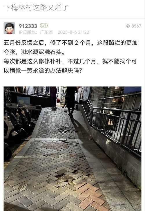 網(wǎng)友您好,您的留言已收悉,現(xiàn)將相關(guān)處理情況回復(fù)如下:經(jīng)核實(shí),梅林街道圍面一街(四號(hào)路)存在人行道部分破損坑洼問(wèn)題,收到您的反映后梅林街道已第一時(shí)間協(xié)調(diào)市交通運(yùn)輸局福田管理局安排道路養(yǎng)護(hù)單位進(jìn)行修復(fù),并于2025年8月7日下午完成。后續(xù)梅林街道將加強(qiáng)巡查,及時(shí)協(xié)調(diào)管養(yǎng)單位進(jìn)行維護(hù),督促落實(shí)管養(yǎng)責(zé)任。如您有其他意見(jiàn)建議,歡迎直接電話聯(lián)系梅林街道應(yīng)急辦075523996865反映,感謝您的支持和理解!