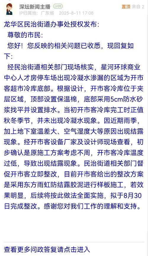 經(jīng)民治街道相關(guān)部門(mén)現(xiàn)場(chǎng)核實(shí),星河環(huán)球商業(yè)中心人才房停車(chē)場(chǎng)出現(xiàn)冷凝水滲漏的區(qū)域?yàn)殚_(kāi)市客超市冷庫(kù)底部。根據(jù)設(shè)計(jì),開(kāi)市客冷庫(kù)位于夾層區(qū)域,頂部設(shè)置保溫棉,底部采用5cm防水砂漿找平并設(shè)置排水。當(dāng)初開(kāi)市客冷庫(kù)完工時(shí)正值秋冬季節(jié),并未出現(xiàn)冷凝水現(xiàn)象。因近期雨季,加上地下室溫差大、空氣濕度大等原因出現(xiàn)結(jié)露現(xiàn)象。經(jīng)開(kāi)市客設(shè)備廠家及設(shè)計(jì)師現(xiàn)場(chǎng)查看,初步確認(rèn)是原施工方案考慮不周,開(kāi)市客冷庫(kù)溫度過(guò)低,導(dǎo)致出現(xiàn)結(jié)露現(xiàn)象。民治街道相關(guān)部門(mén)督促開(kāi)市客立即整改,目前開(kāi)市客給出的整改方案是采用東方雨虹防結(jié)露膠泥進(jìn)行樣板施工,若效果明顯,后續(xù)將按此做法全面實(shí)施,擬于8月30日完成整改。感謝您對(duì)我們工作的理解和支持。