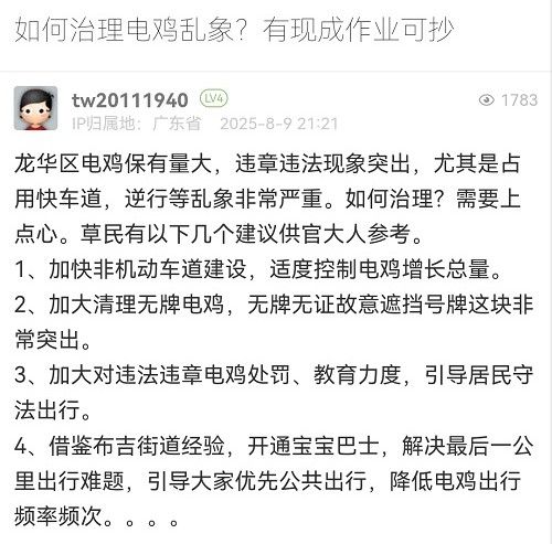 感謝您的反饋。龍華區(qū)作為深圳市的中軸新城,產(chǎn)業(yè)密集、人口居住集中,轄區(qū)電動(dòng)自行車(chē)保有量同樣呈快速增長(zhǎng)狀態(tài),目前龍華區(qū)的非機(jī)動(dòng)車(chē)占全市總量約五分之一。一直以來(lái),深圳市公安局交通管理局龍華大隊(duì)高度重視電動(dòng)自行車(chē)安全管理工作,從通行管理、秩序整治、隱患治理、宣傳教育四大方面綜合施策,不斷優(yōu)化治理策略,切實(shí)提升電動(dòng)自行車(chē)交通管理水平。您的建議我們也會(huì)向相關(guān)部門(mén)反饋,共同努力治理電動(dòng)車(chē)。再次感謝您對(duì)交通管理工作的支持和理解!