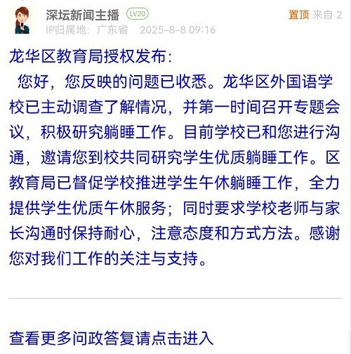 您好,您反映的問(wèn)題已收悉。龍華區(qū)外國(guó)語(yǔ)學(xué)校已主動(dòng)調(diào)查了解情況,并第一時(shí)間召開(kāi)專題會(huì)議,積極研究躺睡工作。目前學(xué)校已和您進(jìn)行溝通,邀請(qǐng)您到校共同研究學(xué)生優(yōu)質(zhì)躺睡工作。區(qū)教育局已督促學(xué)校推進(jìn)學(xué)生午休躺睡工作,全力提供學(xué)生優(yōu)質(zhì)午休服務(wù);同時(shí)要求學(xué)校老師與家長(zhǎng)溝通時(shí)保持耐心,注意態(tài)度和方式方法。感謝您對(duì)我們工作的關(guān)注與支持。