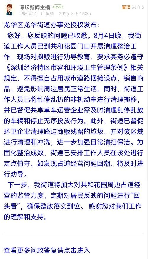 下一步,我街道將加大對(duì)共和花園周邊占道經(jīng)營(yíng)的監(jiān)管力度,定期對(duì)居民反映的問(wèn)題進(jìn)行“回頭看”,確保整改落實(shí)到位。 感謝您對(duì)我們工作的理解和支持。