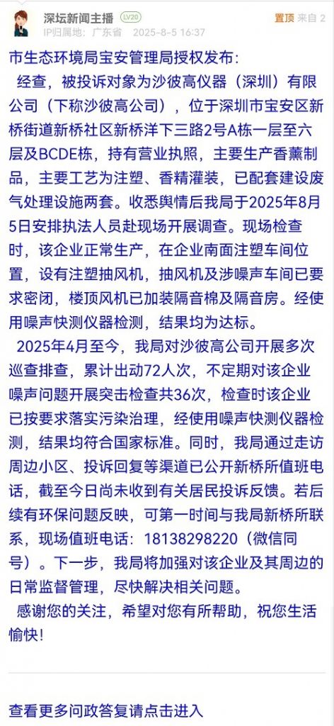 經(jīng)查,被投訴對(duì)象為沙彼高儀器(深圳)有限公司(下稱沙彼高公司),位于深圳市寶安區(qū)新橋街道新橋社區(qū)新橋洋下三路2號(hào)A棟一層至六層及BCDE棟,持有營(yíng)業(yè)執(zhí)照,主要生產(chǎn)香薰制品,主要工藝為注塑、香精灌裝,已配套建設(shè)廢氣處理設(shè)施兩套。收悉輿情后我局于2025年8月5日安排執(zhí)法人員赴現(xiàn)場(chǎng)開(kāi)展調(diào)查。現(xiàn)場(chǎng)檢查時(shí),該企業(yè)正常生產(chǎn),在企業(yè)南面注塑車(chē)間位置,設(shè)有注塑抽風(fēng)機(jī),抽風(fēng)機(jī)及涉噪聲車(chē)間已要求密閉,樓頂風(fēng)機(jī)已加裝隔音棉及隔音房。經(jīng)使用噪聲快測(cè)儀器檢測(cè),結(jié)果均為達(dá)標(biāo)。