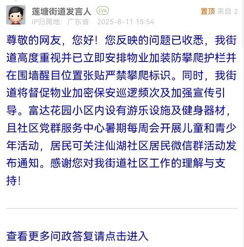 尊敬的網(wǎng)友,您好!您反映的問(wèn)題已收悉,我街道高度重視并已立即安排物業(yè)加裝防攀爬護(hù)欄并在圍墻醒目位置張貼嚴(yán)禁攀爬標(biāo)識(shí)。同時(shí),我街道將督促物業(yè)加密保安巡邏頻次及加強(qiáng)宣傳引導(dǎo)。富達(dá)花園小區(qū)內(nèi)設(shè)有游樂(lè)設(shè)施及健身器材,且社區(qū)黨群服務(wù)中心暑期每周會(huì)開(kāi)展兒童和青少年活動(dòng),居民可關(guān)注仙湖社區(qū)居民微信群活動(dòng)發(fā)布通知。感謝您對(duì)我街道社區(qū)工作的理解與支持!