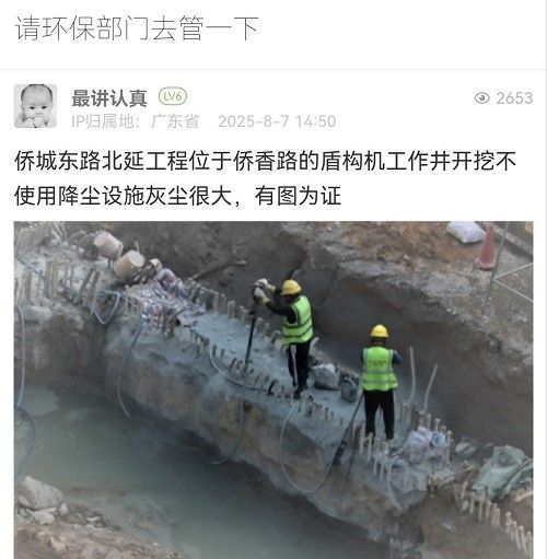 網(wǎng)友,您好!經(jīng)核實(shí),該處為僑城東路北延通道工程盾構(gòu)工作井施工現(xiàn)場(chǎng),現(xiàn)場(chǎng)圍擋已安裝自動(dòng)噴淋系統(tǒng),并在主要施工區(qū)域設(shè)置霧炮機(jī)。目前現(xiàn)場(chǎng)正在開(kāi)展鑿除地連墻混凝土施工,因作業(yè)點(diǎn)較分散,我們已安排施工單位增加霧炮機(jī),確保易揚(yáng)塵面濕法連續(xù)作業(yè)。后續(xù)將安排專人專責(zé),加強(qiáng)工地現(xiàn)場(chǎng)常態(tài)化巡視巡檢,做好防塵防護(hù)措施。感謝您的關(guān)注和理解!
