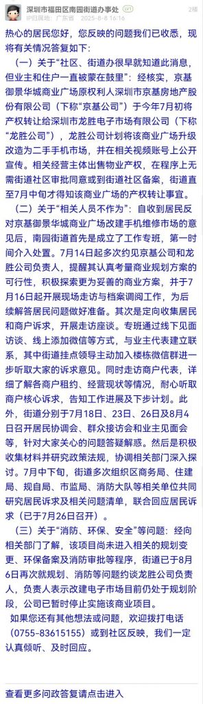 (二)關(guān)于“相關(guān)人員不作為”:自收到居民反對(duì)京基御景華城商業(yè)廣場(chǎng)改建手機(jī)維修市場(chǎng)的意見(jiàn)后,南園街道首先是成立了工作專班,第一時(shí)間介入處置。7月14日起多次約見(jiàn)京基公司和龍勝公司負(fù)責(zé)人,提醒其認(rèn)真考量商業(yè)規(guī)劃方案的可行性,積極探索更為妥善的商業(yè)方案,并于7月16日起開(kāi)展現(xiàn)場(chǎng)走訪與檔案調(diào)閱工作,為后續(xù)解答居民問(wèn)題做好準(zhǔn)備。其次是定向收集居民和商戶訴求,開(kāi)展走訪座談。專班通過(guò)線下見(jiàn)面訪談、線上添加微信等方式,與業(yè)主代表建立聯(lián)系,其中街道掛點(diǎn)領(lǐng)導(dǎo)主動(dòng)加入樓棟微信群進(jìn)一步聽(tīng)取大家的訴求意見(jiàn)。同時(shí)走訪商戶代表,詳細(xì)了解各商戶租約、經(jīng)營(yíng)現(xiàn)狀等情況,耐心聽(tīng)取商戶核心訴求,告知工作進(jìn)展及下步計(jì)劃。此外,街道分別于7月18日、23日、26日及8月4日召開(kāi)居民協(xié)調(diào)會(huì)、群眾接訪會(huì)和業(yè)主見(jiàn)面會(huì)等,針對(duì)大家關(guān)心的問(wèn)題答疑解惑。然后是積極收集材料并研究政策法規(guī),協(xié)調(diào)相關(guān)部門(mén)深入探討。7月中下旬,街道多次組織區(qū)商務(wù)局、住建局、規(guī)自局、市監(jiān)局、消防大隊(duì)等相關(guān)單位共同研究居民訴求及相關(guān)問(wèn)題清單,聯(lián)合回應(yīng)居民訴求(已于7月26日召開(kāi))。