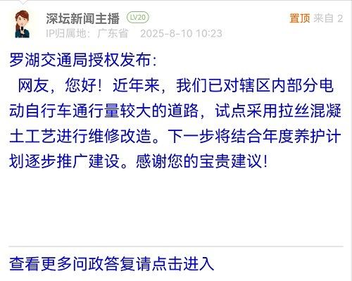 網(wǎng)友,您好!近年來(lái),我們已對(duì)轄區(qū)內(nèi)部分電動(dòng)自行車(chē)通行量較大的道路,試點(diǎn)采用拉絲混凝土工藝進(jìn)行維修改造。下一步將結(jié)合年度養(yǎng)護(hù)計(jì)劃逐步推廣建設(shè)。感謝您的寶貴建議!