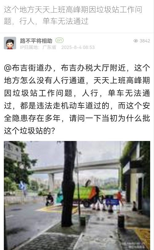 1. 帖文《這個(gè)地方天天上班高峰期因垃圾站工作問(wèn)題,行人,單車(chē)無(wú)法通過(guò)》