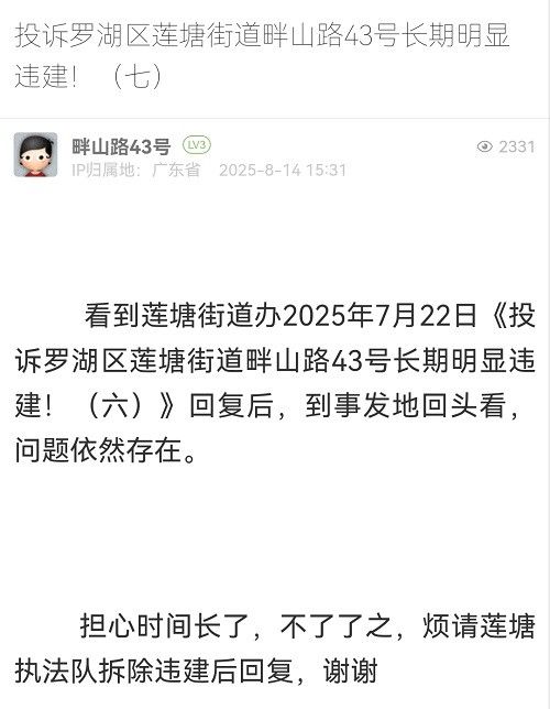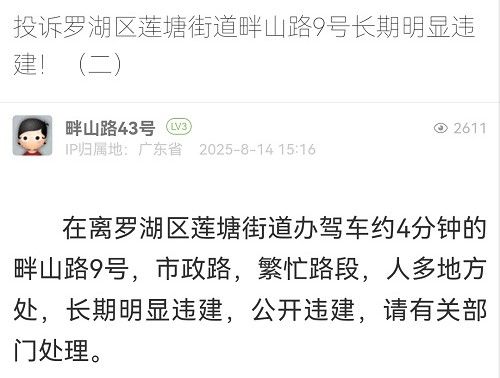 15. 帖文《投訴羅湖區(qū)蓮塘街道畔山路43號(hào)長期明顯違建!(七)》