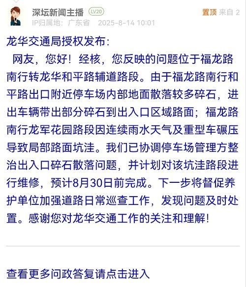 網(wǎng)友,您好!經(jīng)核,您反映的問題位于福龍路南行轉(zhuǎn)龍華和平路輔道路段。由于福龍路南行和平路出口附近停車場(chǎng)內(nèi)部地面散落較多碎石,進(jìn)出車輛帶出部分碎石到出入口區(qū)域路面;福龍路南行龍軍花園路段因連續(xù)雨水天氣及重型車碾壓導(dǎo)致局部路面坑洼。我們已協(xié)調(diào)停車場(chǎng)管理方整治出入口碎石散落問題,并計(jì)劃對(duì)該坑洼路段進(jìn)行維修,預(yù)計(jì)8月30日前完成。下一步將督促養(yǎng)護(hù)單位加強(qiáng)道路日常巡查工作,發(fā)現(xiàn)問題及時(shí)處置。感謝您對(duì)龍華交通工作的關(guān)注和理解!